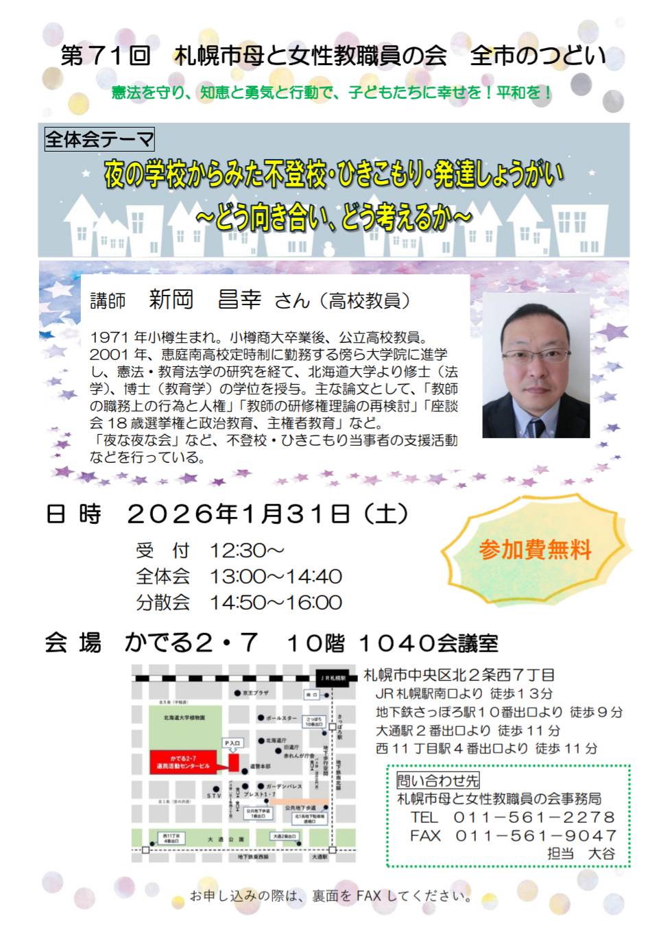- 第67回札幌市母と女性教職員の会「全市のつどい」の詳細を掲載しました。